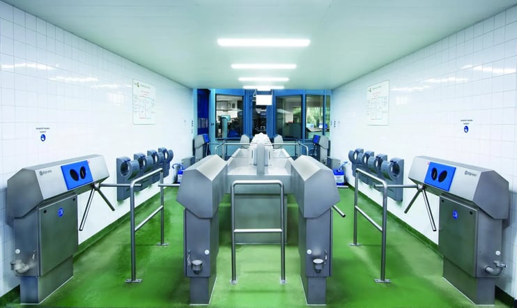 El personal es conducido por una compuerta higiénica antes de entrar en la planta. En la compuerta se realizan las tareas de lavado y desinfección necesarias. Con una buena explicación y formación, sus empleados sabrán qué se espera de ellos. A veces se necesita algo más y se elige un sistema con una barrera, un torniquete. El sensor en el sistema registra si se han llevado a cabo determinadas tareas en la compuerta higiénica; de haberlas realizado, la barrera se abre automáticamente.