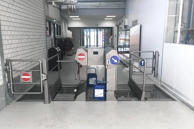 - The cleaning and disinfecting of the wheels of transport trolleys in a disinfection bath that is situated next to the disinfection bath before the sole cleaning area. The swing gate after this bath is released by a magnetic circuit after the hand disinfection.