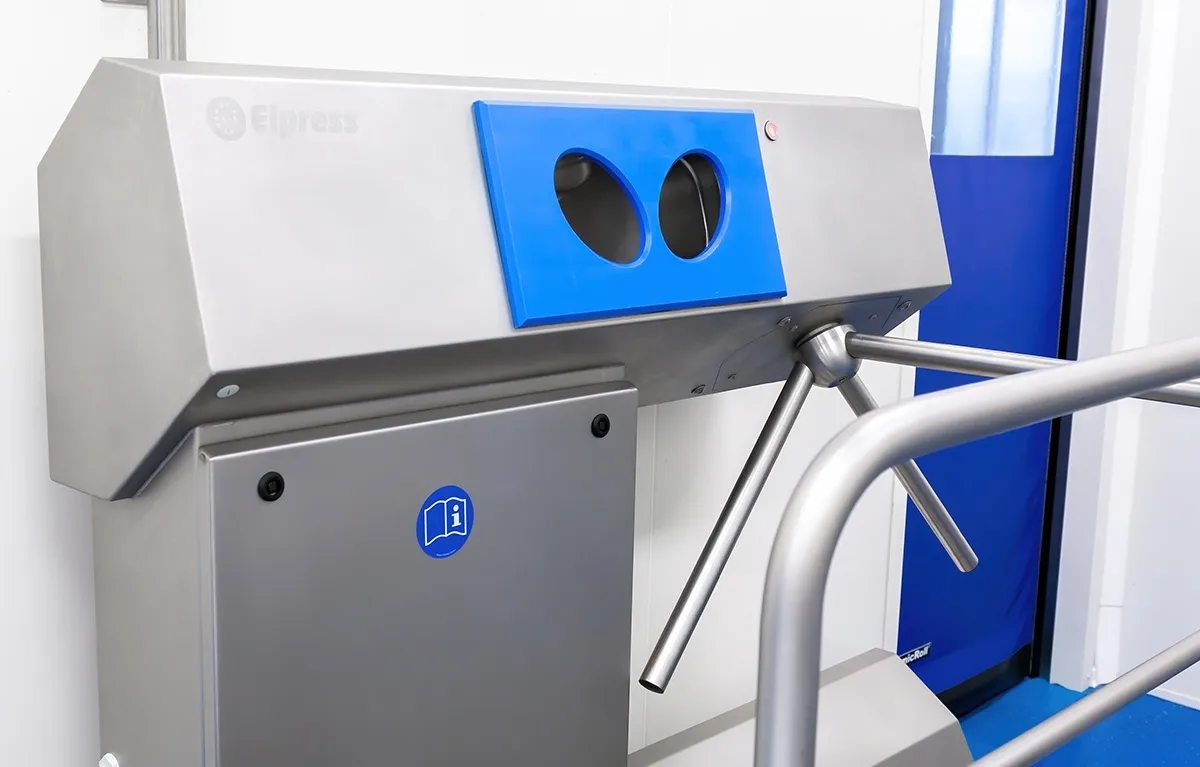 In the first part of the hygiene passage, the employees pass through a soap dispenser with access control. Access to the next phase is granted only after employees have used the soap dispenser.